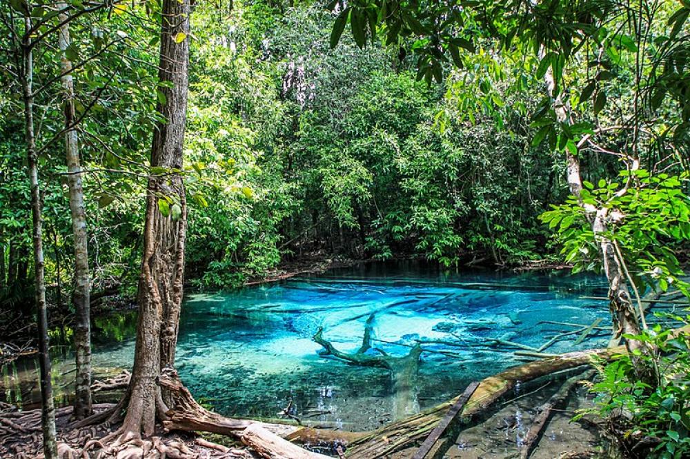 Krabi Emerald Pool (Sa Morakot) is a unique attraction in southern Thailand. Krabi is well-known for areas of outstanding natural beauty and one place that should make your must-see list is the Emerald Pool in the Thung Teao Forest Natural Park, an unusual lowland forest rich in bio-diversity, complete with a nature trail and a crystal pond. Located in the Khao Pra-Bang Kram area, the nature trek is a superb place to spot rare animals and plant species including the Pitta Gurney bird which was once considered extinct. The forest is lush with age-old trees stretching up to the sky, unusual forest creatures and limestone foothills that open onto a dazzling emerald pool. There is a park office close by at Ban Bang Teao which offers some information although their primary goal is to ensure that the no-hunting zone is enforced and that no harm comes to this naturally beautiful sanctuary.